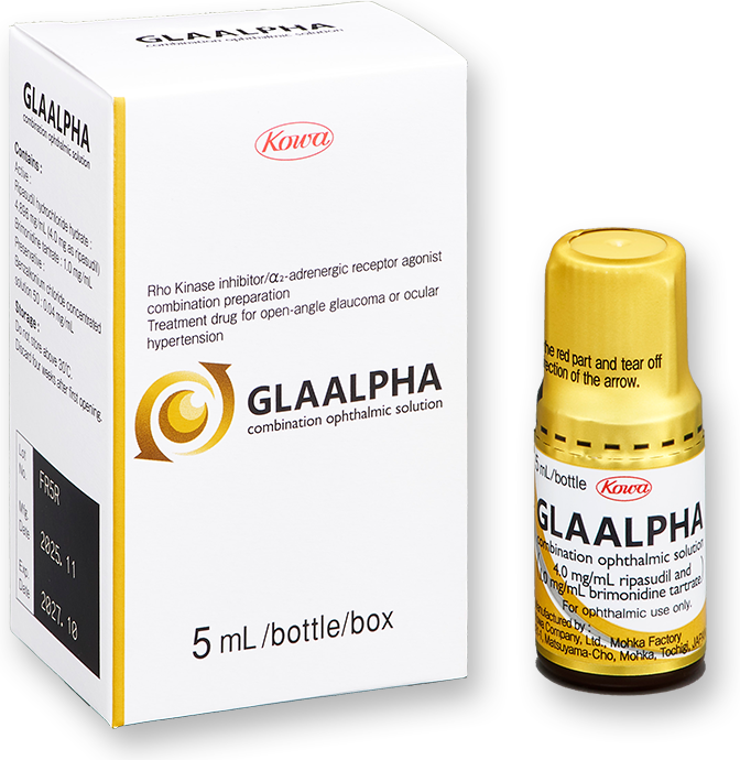 Glaalpha Combination Ophthalmic Solution is an ophthalmic agent for the treatment of glaucoma containing ripasudil hydrochloride hydrate (0.4%), a Rho kinase inhibitor, and brimonidine tartrate (0.1%), an α2 adrenoreceptor agonist, as active ingredients.